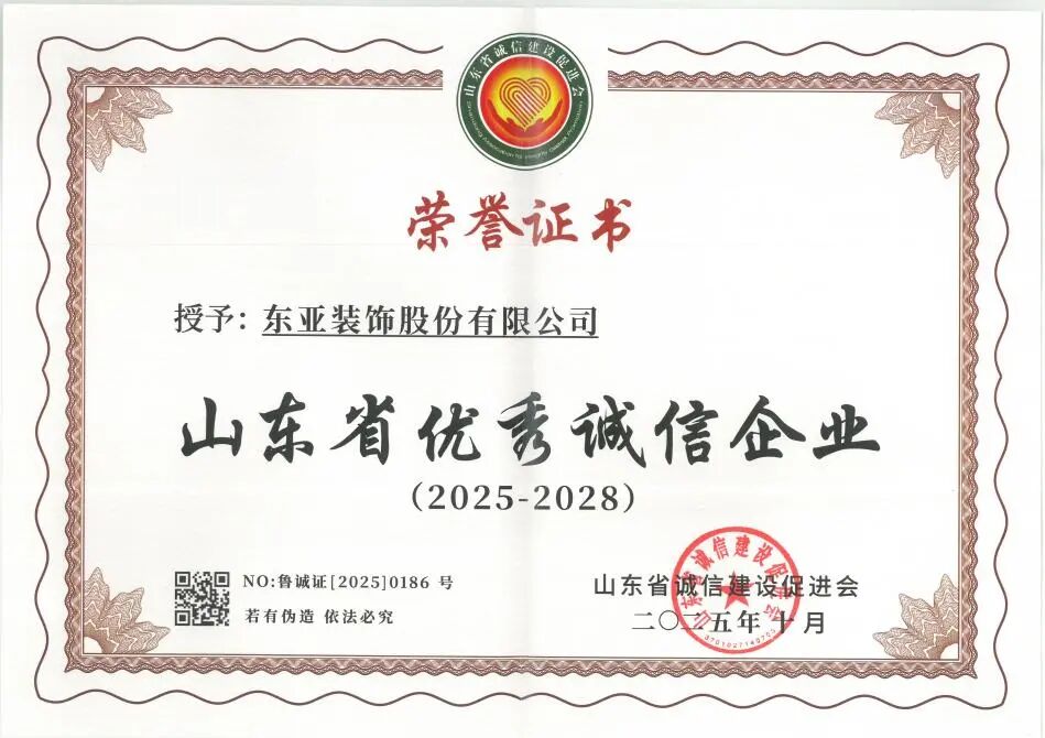 近日,在首届山东省建筑企业诚信建设峰会上,东亚装饰股份有限公司凭借长期以来在诚信经营、合规管理及品质服务等方面的突出表现,成功获评首届建筑业 “山东省优秀诚信企业” 称号。