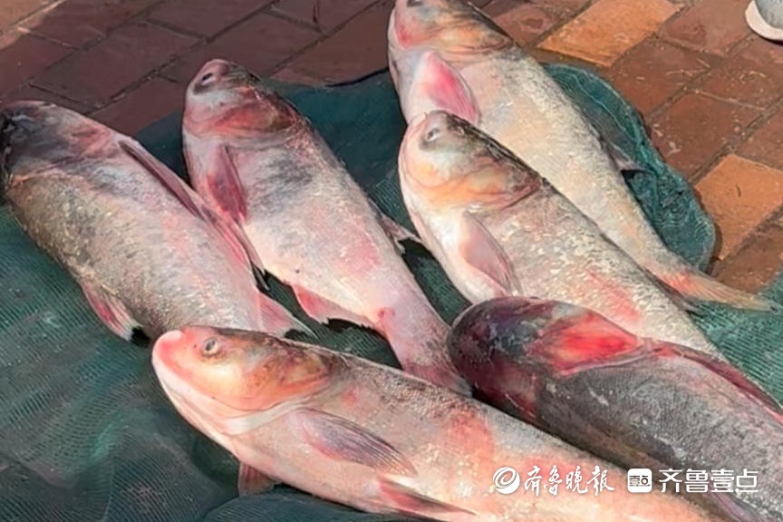 河道中,有人动作娴熟地用网兜一舀好几条;也有人结伴而来,用渔网形成一道屏障。水库两岸,则摆满了市民刚捕捞上来的鲢鱼,有的鱼还在奋力摆尾。