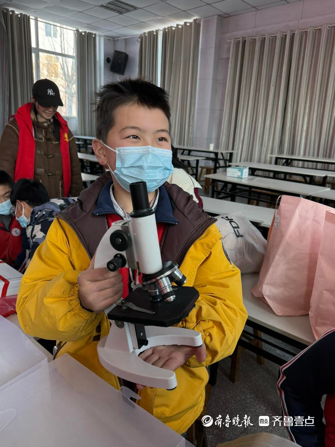 志愿者们为一名12岁男孩送来他的“新年心愿”礼物——一台显微镜,男孩的欢喜溢于言表。