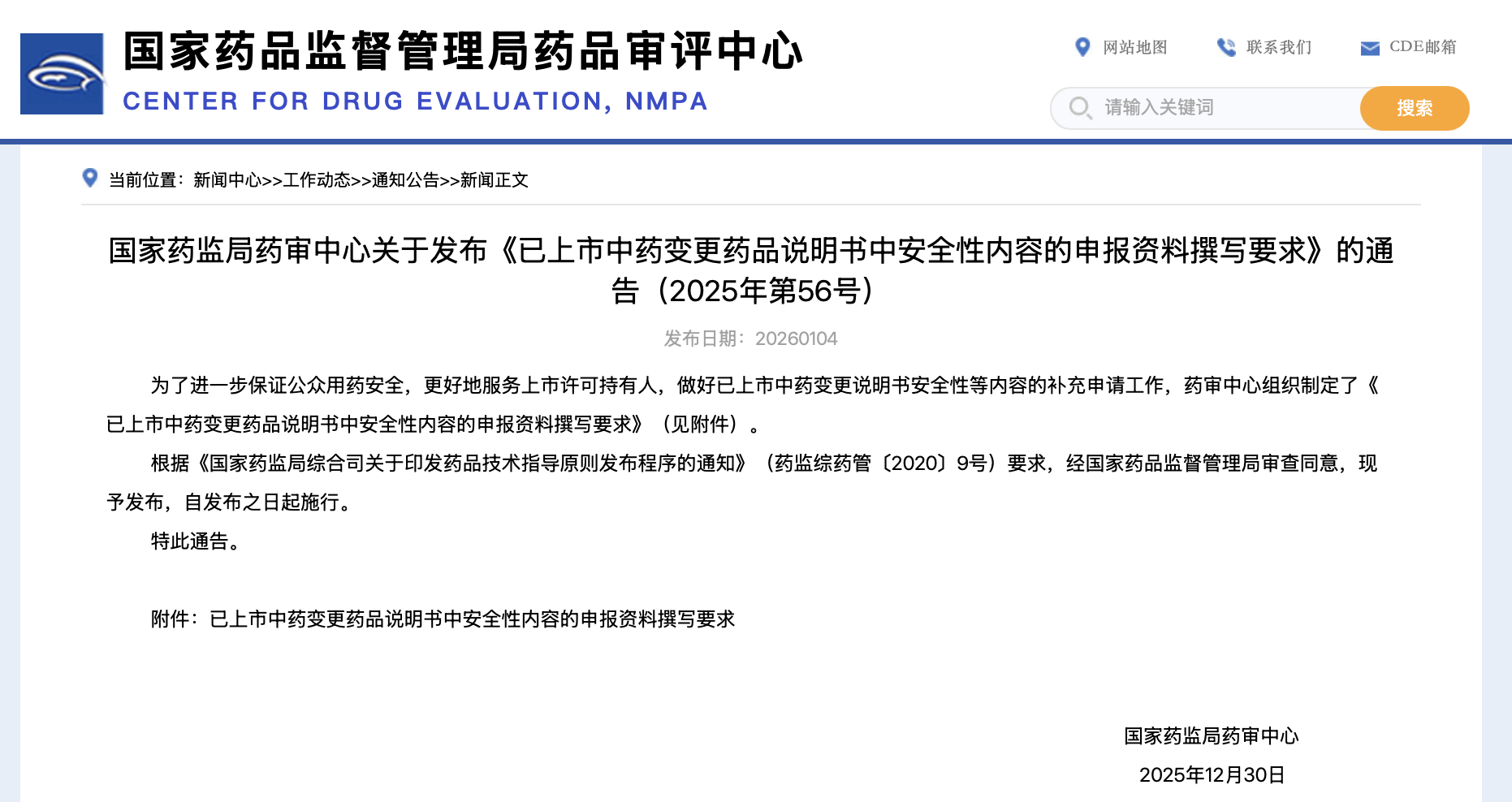 2025年12月,国家药监局药审中心进一步发布《已上市中药变更药品说明书中安全性内容的申报资料撰写要求》,针对申报资料中的“说明书”“产品安全性相关资料综述”等核心项目提出具体撰写要求,为企业修订说明书提供了明确的技术指导。
