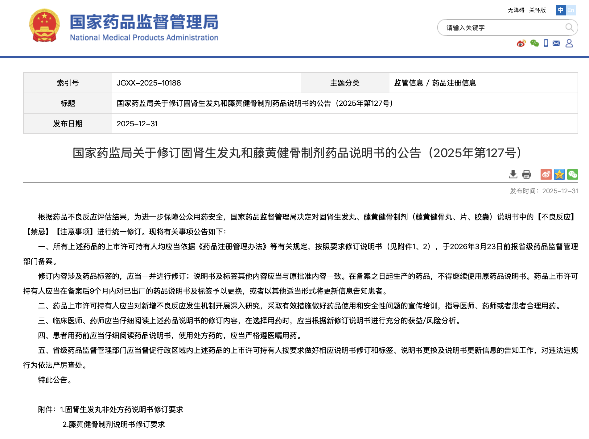 记者查询国家药监局官方网站发现,2025年以来,国家药监局已发布多批中成药说明书修订公告,覆盖活力苏口服液、固肾生发丸、小活络制剂等多个品种,修订重点均集中于【禁忌】【不良反应】【注意事项】三大项目。