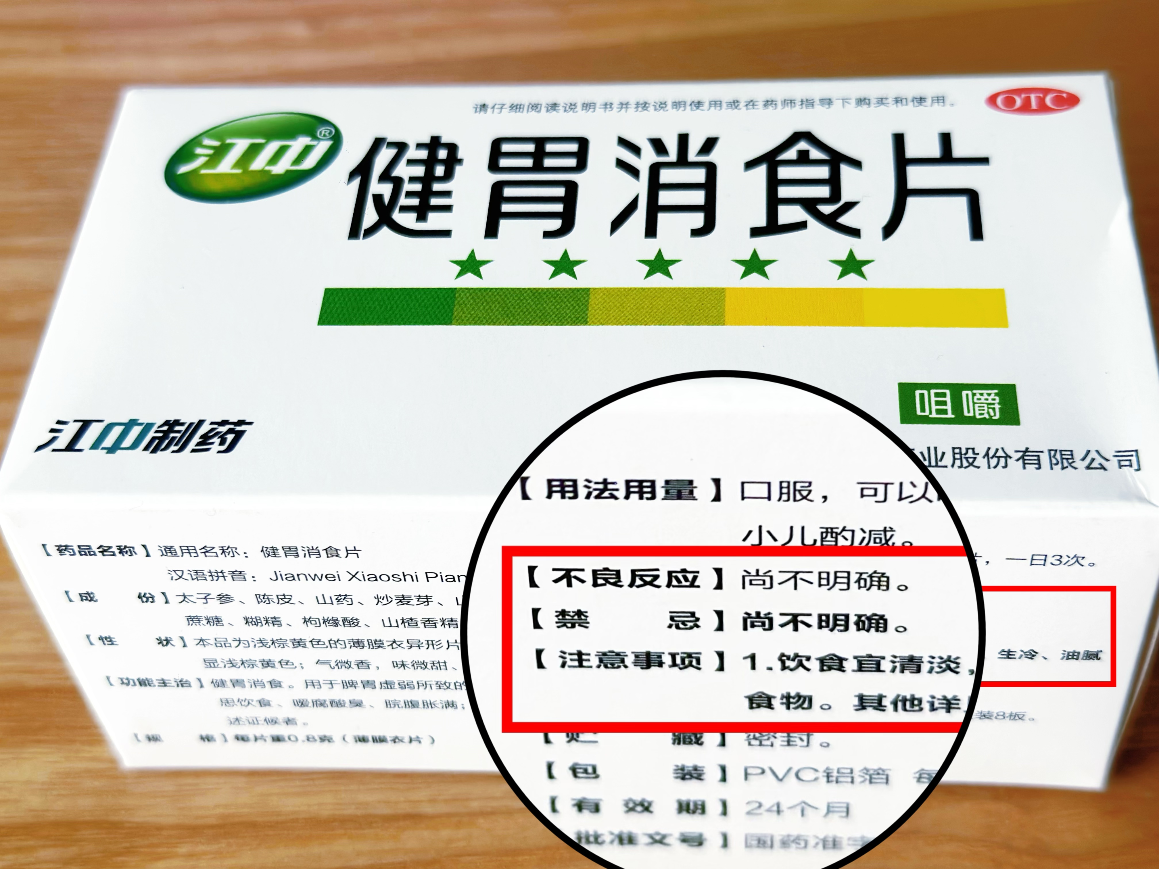 记者梳理家中常备的一些中成药发现,“穿心莲内酯滴丸”“肠炎宁片”两种药物的包装盒上对【不良反应】【禁忌】【注意事项】有详细说明;“绿袍散”“荆防颗粒”“大活络丸”“人工牛黄甲硝唑胶囊”“保和丸”5种药物则在包装盒上标明【不良反应】【禁忌】【注意事项】“详见说明书”;而大家熟知、曝光率更高的江中药业股份有限公司生产的“江中牌”健胃消食片,对【不良反应】【禁忌】的描述都是“尚不明确”。