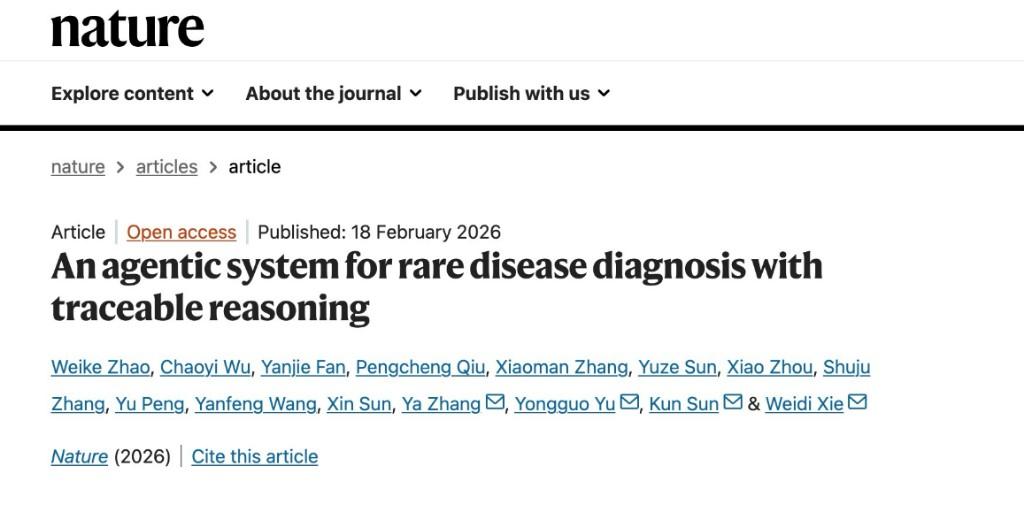 2月19日,国际顶级期刊《自然》在线发表上海交通大学人工智能学院与医学院附属新华医院联合团队的重磅成果——全球首个智能体式罕见病循证推理诊断系统DeepRare,为罕见病“确诊难、漏诊率高”的全球性难题提供了中国解决方案。